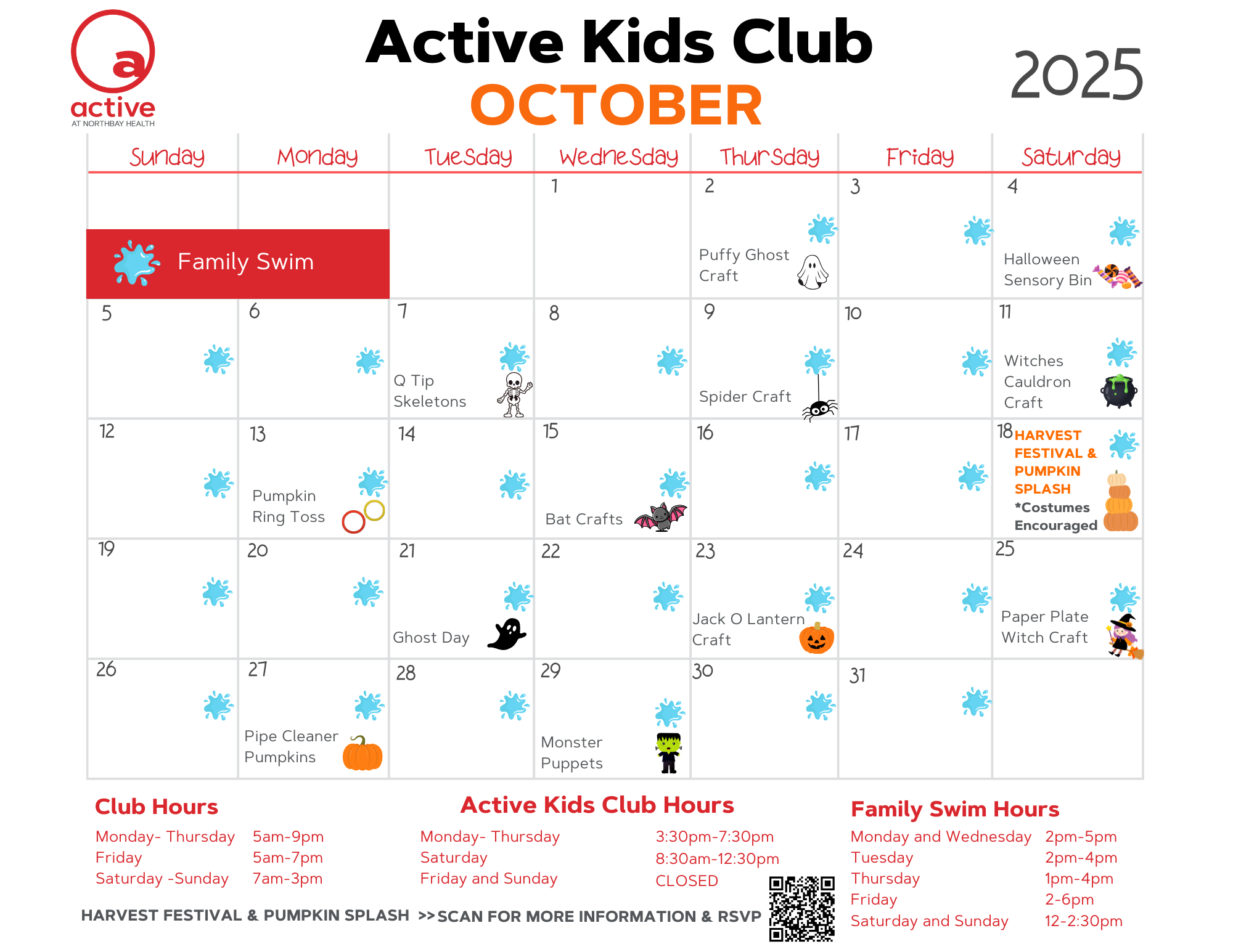 Come enjoy crafts, games, and snacks at our Harvest Festival; then dive into our floating pumpkin patch and snag a pumpkin to take home at our Pumpkin Splash and enjoy Family Swim time.