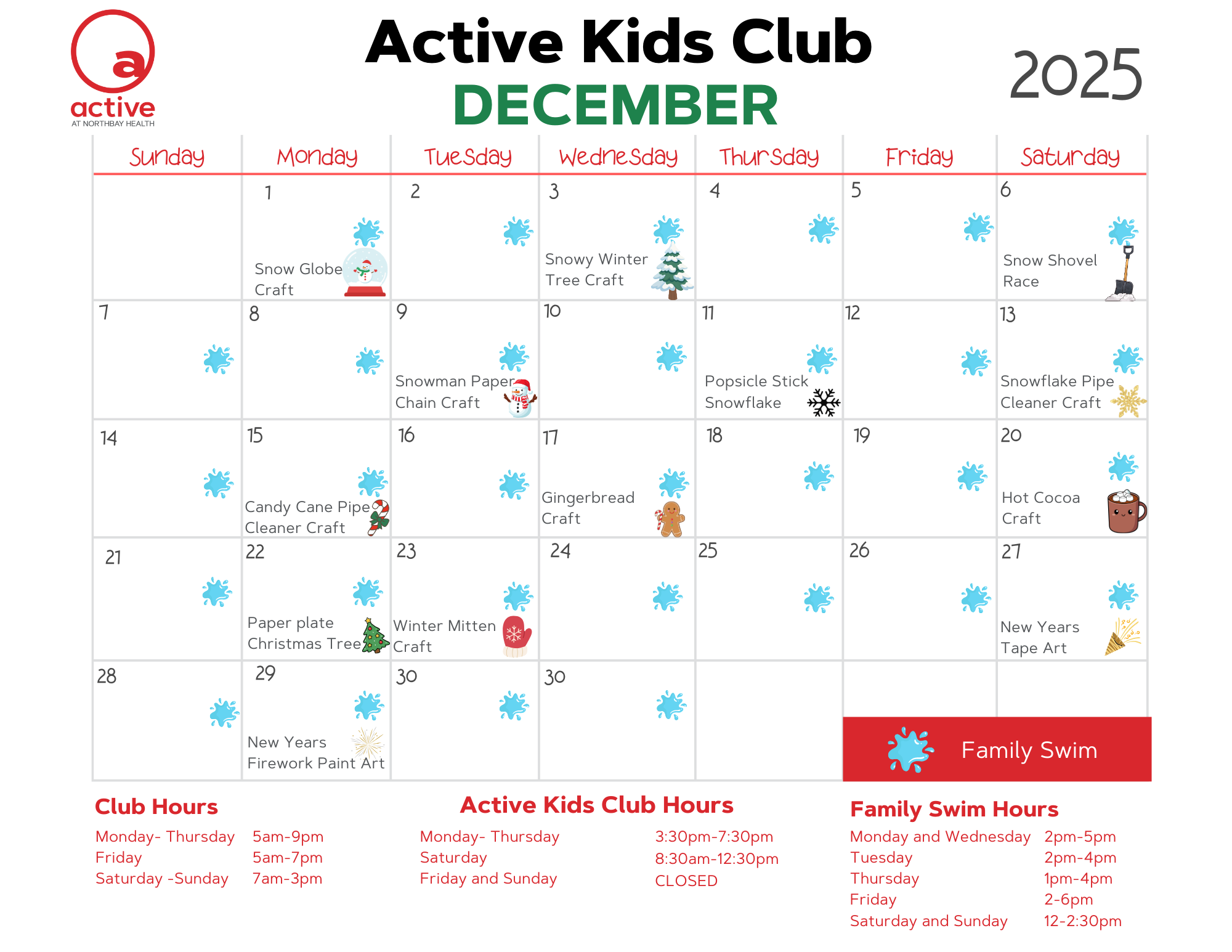Family Swim hours are open to children with Active Kids Memberships. The main pool is open for Family Swim: