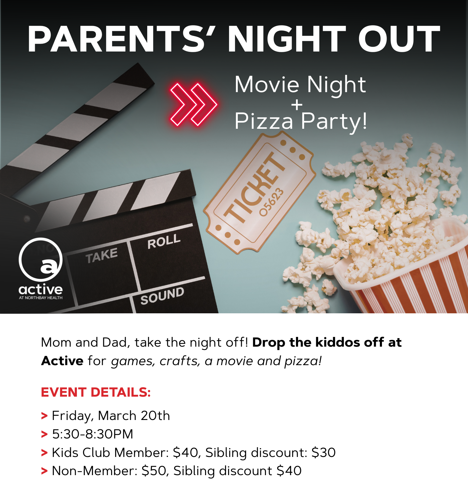 Sometimes the best thing you can possibly do for your kids is to take really good care of yourself. At Active Wellness Center, we took the concept of “family health club” all the way, inviting your children to be creative, socialize and have a blast in a safe environment staffed by our Active Kids Club Team. While you take a little time for yourself, you can feel assured that your child is getting as much out of the experience as you are. At Active at NorthBay, we have indoor and outdoor play areas and host monthly craft and movie nights, included with monthly Active Kids Memberships as well.